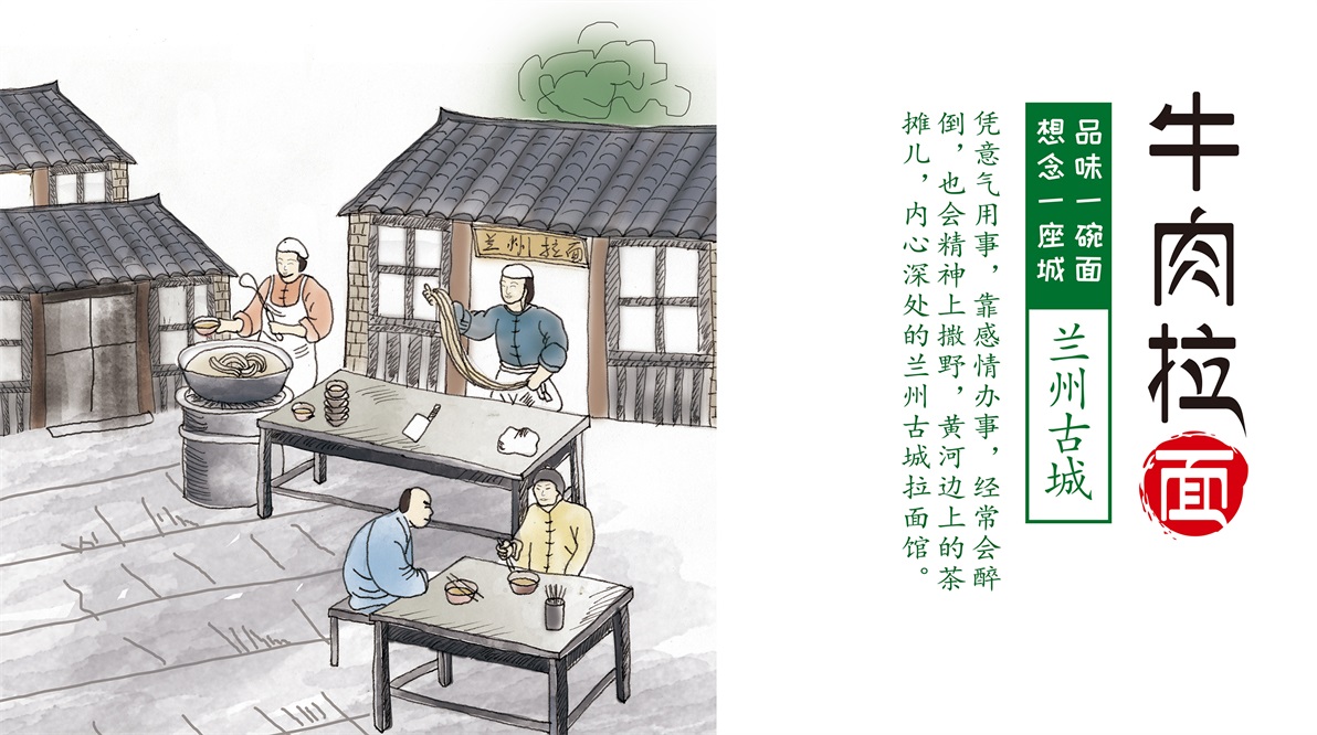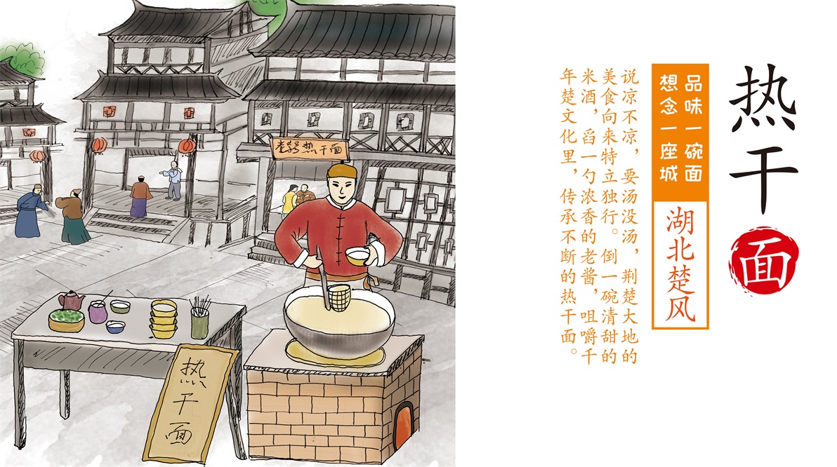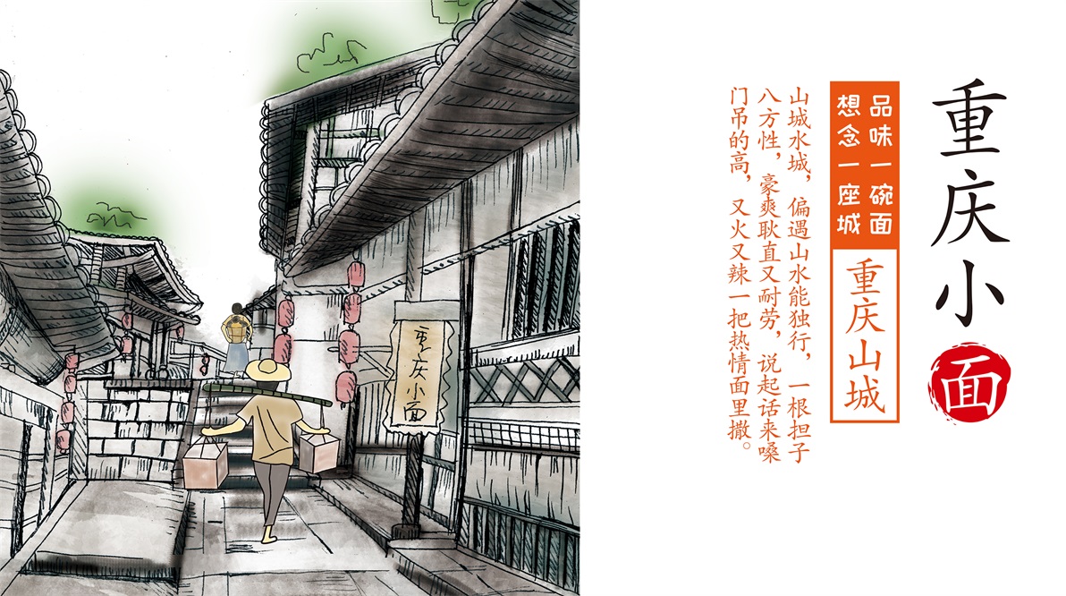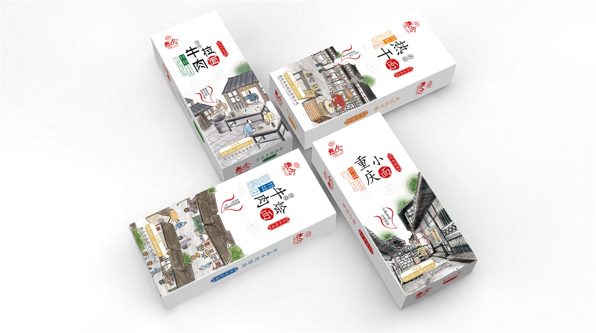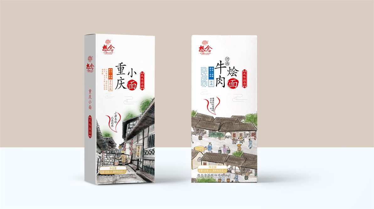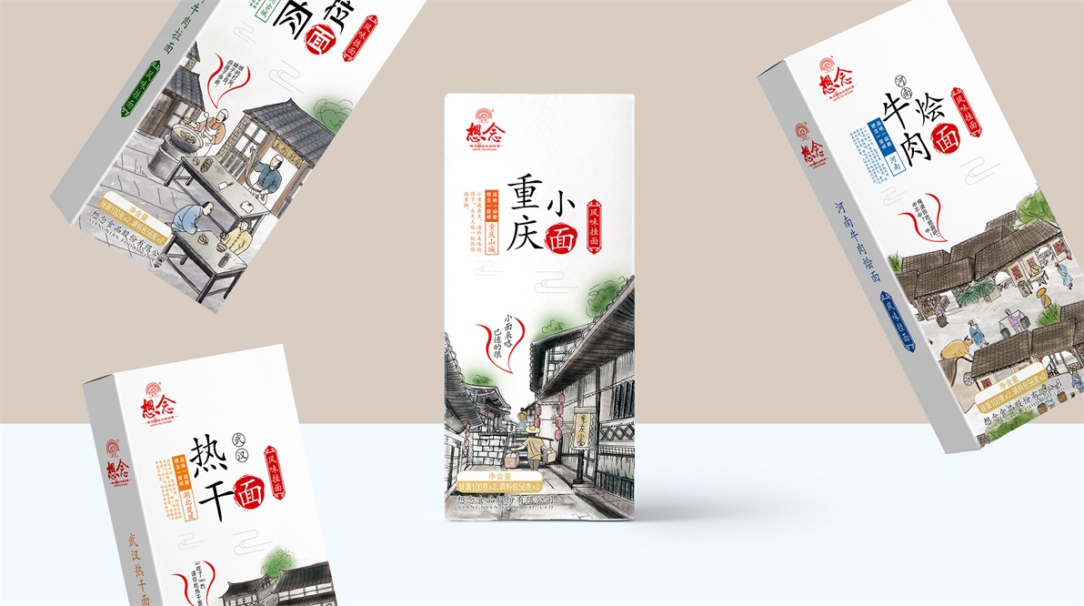想念天下好面系列:重慶小面、武漢熱干面、蘭州牛肉拉面、河南牛肉燴面等產(chǎn)品,在人的視覺中,首先會(huì)被色彩圖片吸引,其次才是文字補(bǔ)充內(nèi)容。至覺設(shè)計(jì)決定通過(guò)插畫形式表現(xiàn)產(chǎn)品特點(diǎn),在認(rèn)知中提起某個(gè)地方我們往往會(huì)想到當(dāng)?shù)亟ㄖ?,在此至覺挖掘更深層的地方特色:通過(guò)本地人的生活方式作為對(duì)產(chǎn)品的融合和體現(xiàn)。重慶的山城、挑擔(dān)、方言。武漢早餐的熱干面小攤。蘭州拉面的獨(dú)特的制面過(guò)程、河南牛肉燴面的黃牛街市。一個(gè)個(gè)場(chǎng)景,讓人看其畫、入其境。并運(yùn)用文案進(jìn)行渲染氛圍。
