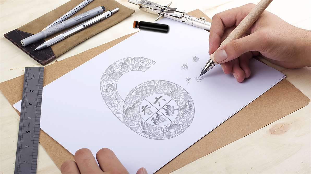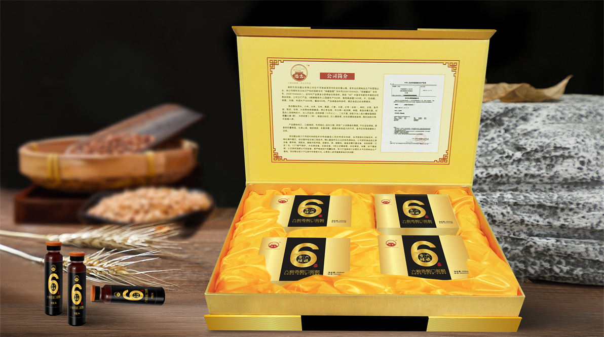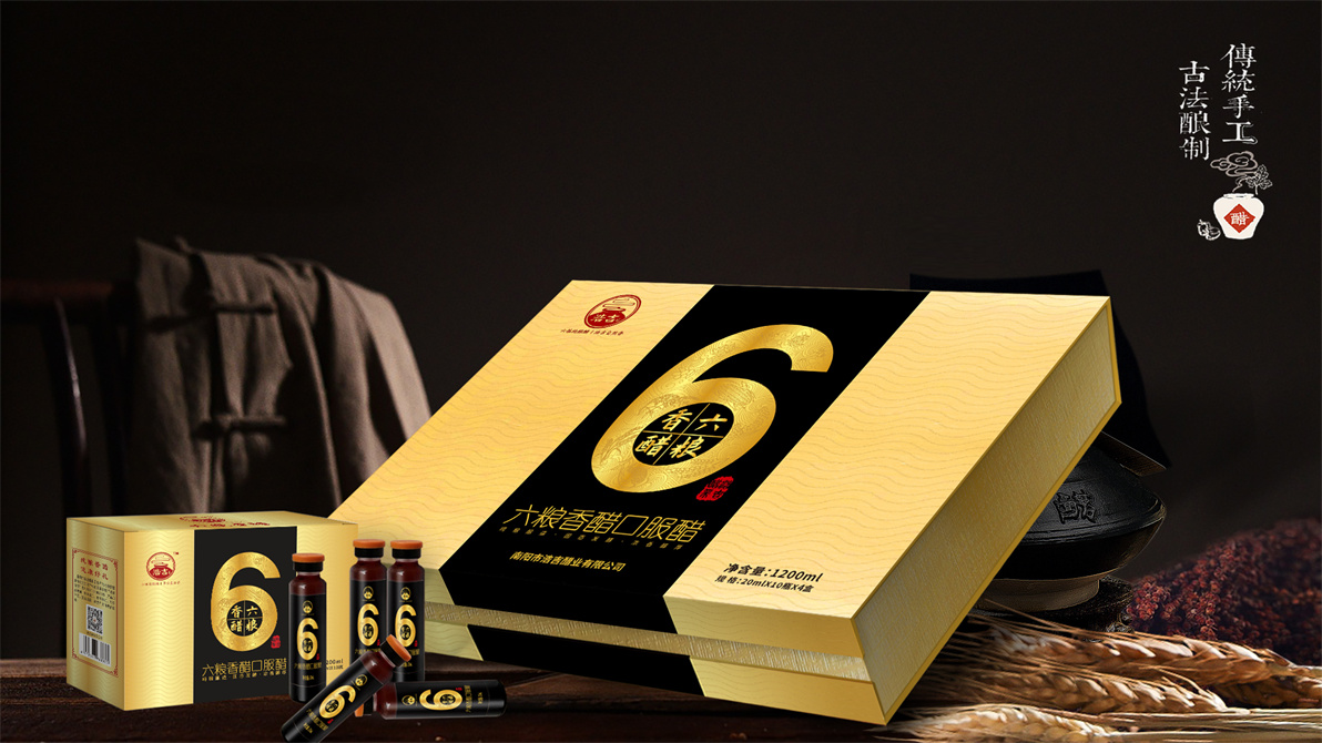 此款產(chǎn)品為浩吉醋業(yè)的禮盒產(chǎn)品——口服醋,采用六種糧食釀制而成,此工藝傳承多年,并因食醋達(dá)到的食療效果被人稱贊,這款產(chǎn)品也已經(jīng)成功申請(qǐng)了證書(shū)。然而我們要知道客戶所講的產(chǎn)品食療,這一點(diǎn)非藥品是不允許成為產(chǎn)品的宣傳點(diǎn)。那么如何通過(guò)包裝信息傳遞產(chǎn)品價(jià)值,體現(xiàn)產(chǎn)品的呢?至覺(jué)通過(guò)對(duì)醋類市場(chǎng)的調(diào)研,市場(chǎng)醋多以高粱、糯米、大米、小麥等原料為主,我們決定換個(gè)角度從原料的工藝入手,產(chǎn)品以六種糧食釀制,將品名以及包裝圖案用六的概念來(lái)進(jìn)行信息傳遞。品名六糧香醋即指由六種糧食釀制,簡(jiǎn)單易懂,主圖案同樣用六種糧食以插畫(huà)的形式與6數(shù)字來(lái)進(jìn)行結(jié)合,6亦是民間的吉祥數(shù)字,六六順等。因此整個(gè)包裝概念就以6來(lái)作為產(chǎn)品視覺(jué)記憶及內(nèi)容宣傳點(diǎn)。